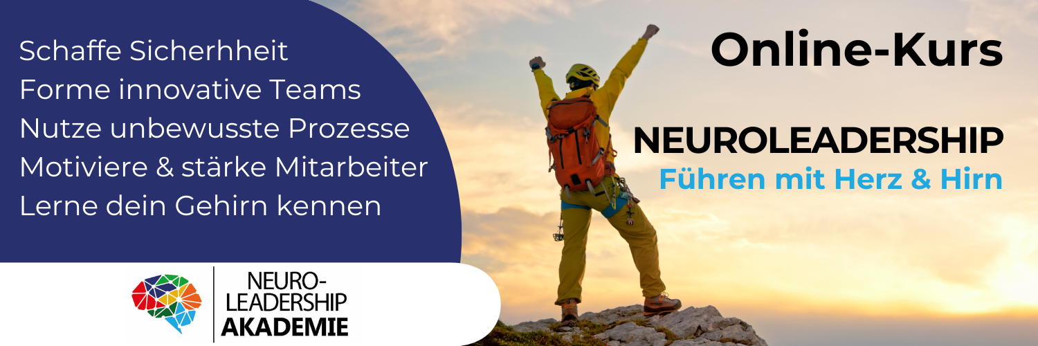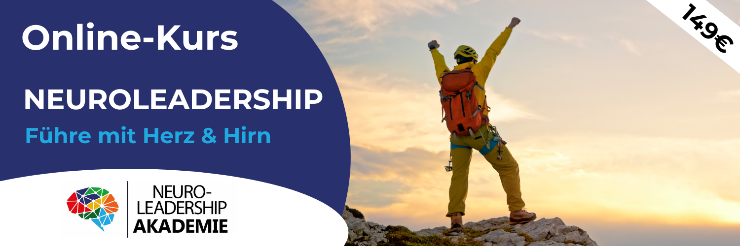 Einen Einblick in das Feld Neuroleadership bietet Dr. Markus Ramming, Professor für angewandte Neurowissenschaften, Trainer und Coach mit seinem Online-Kurs „Neuroleadership, führen mit Herz und Hirn“. Super empfehlenswert. Und mit 149€ spottbillig. Am besten sofort zuschlagen, ich weiß nicht wie lange er den Preis noch hält.